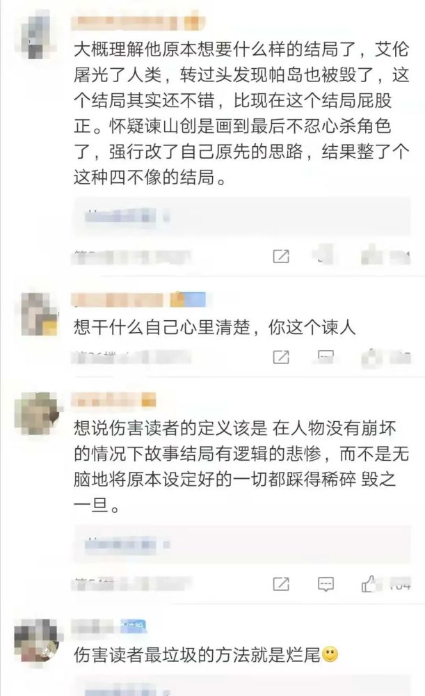当然,谏山创也并未给出一种选择,他将多个选择摆在读者面前,读者也由此分裂成多个派别。包括给艾尔迪亚人“安乐死”的“吉派”、反对灭世的“韩派”、激进灭世的“耶派”,当然还有以阿尔敏为首的let’s talk talk派。