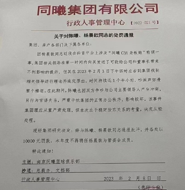 通报指出,对于杨晨歆自称同曦老板娘这件事,集团领导很早就提醒过她,这样会给公司和董事长带来不好的影响。但是2月3日下午,陈曦和杨晨歆夫妻俩来到公司与相关领导发生冲突。在官方通报中,同曦用了“吵闹声弥漫整个刘楼层”来形容,足以见得二人情绪之激动、冲突之激烈。最终,考虑到股东关系,同曦从轻发落——陈曦和杨晨歆通报批评,各处罚10000元,杨晨歆被免职,本年度不再担任管委会成员。