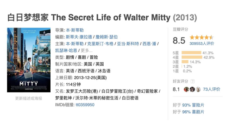 和众多好莱坞的大片相比,这个故事好像有些平凡,但每次看总给我一些触动。可能每个人的生活中总有那么一个阶段,想出去却不敢,只能在白日梦里获得满足感,醒来之后又开始感到空虚、难受、生无可恋,不得已只能继续把梦做下去,反反复复……