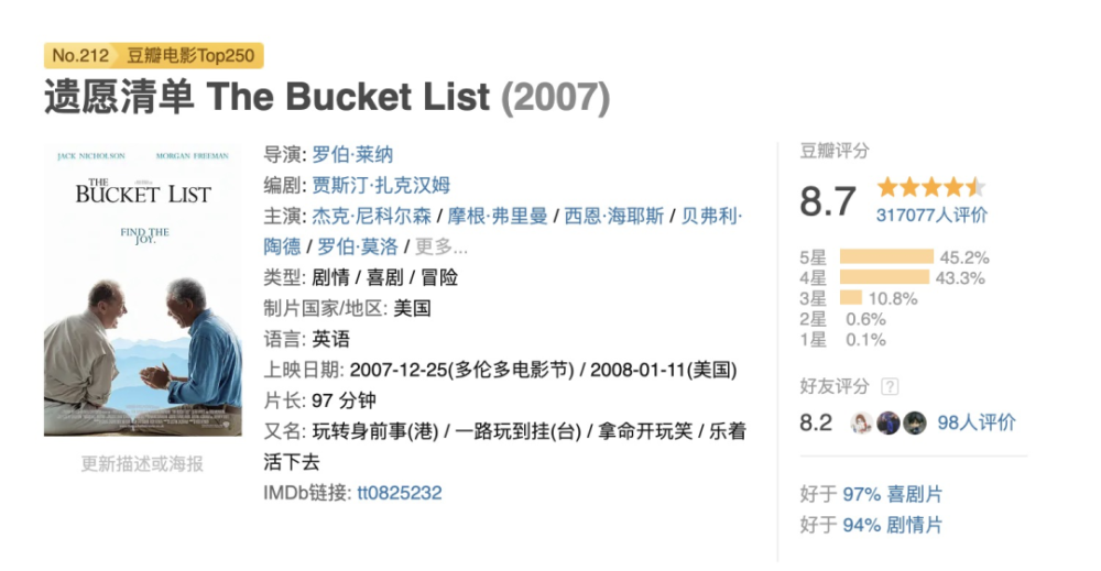 有钱也不能阻止死神的降临,两位身患癌症的老年病人,亿万身家的爱德华和修了一辈子汽车的卡特,在机缘巧合之下相识结为好友。弥留之际,二人决定在余下的日子里,完成他们内心所想的“遗愿清单”的故事。