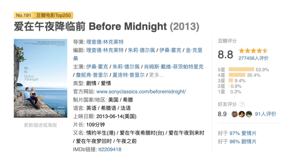 同样,影片中男女主依然在舒缓的、漫长的对话中讨论了很多关于人生、爱情的哲学话题。如果没看前两部,可能有些小伙伴会不太适应这样的节奏和手法。但当你细细品味的时候,原来那就是真的生活。