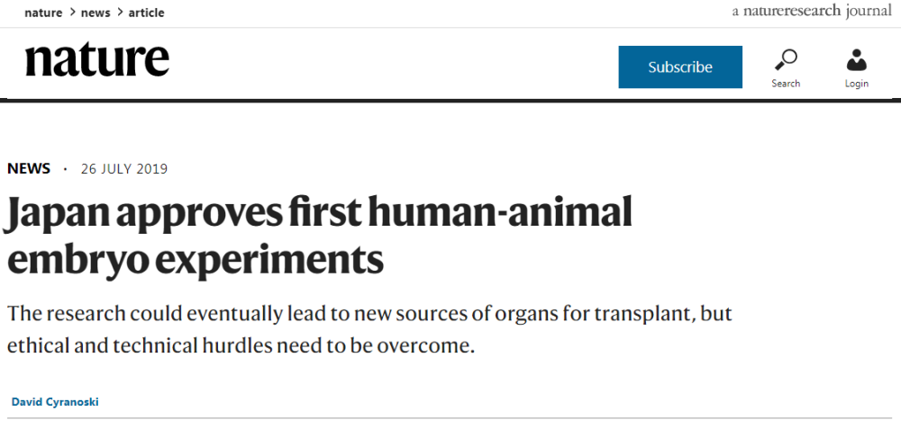 2019年7月26日,《Nature》有一篇新闻稿件着实让大家吓了一跳,“Japan approves first human-animal embryo experiments”,按比较文雅的翻译就是“日本批准首项人类动物胚胎实验”,但按自媒体标准译法直接就是“日本批准任何动物杂交实验”!