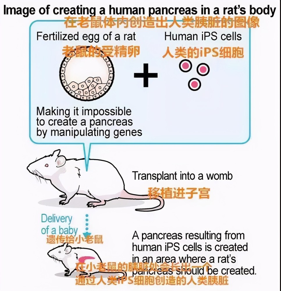 早在2017年时,研究团队利用小鼠的iPS细胞植入到了大鼠胚胎中,然后让其定向发展成了胰腺,等这个大鼠胚胎降生后将胰腺取出,植入到了一只患有糖尿病的小鼠体内,使其能够有效控制血糖水平,治愈了小鼠的糖尿病。