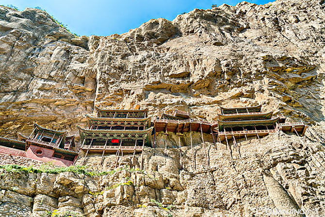 悬空寺全寺为木质结构,建造在距离地面90米高的悬崖上,而且它整个的建筑都是悬在半空的。令人难以置信的是,所有楼阁的底层似乎从悬崖的立面中凸了出来,看上去楼阁就像挂在悬崖上一样。站在如此高的悬崖上往下看,就好像站在30层的楼顶往下看一样,任何人到了这儿,恐怕都有心惊目眩的感觉。远远望去悬空寺,似琼楼相隔如雏凤凌空,当地有句民谣说,悬空寺半天高,三根马尾空中吊。前人赞叹悬空寺说飞阁丹岩上白云几度风蜃楼疑海上,鸟道没云中,诗仙李白挥毫书写“壮观”二字,称奇!徐霞客则以“天下巨观”而赞颂悬空寺!