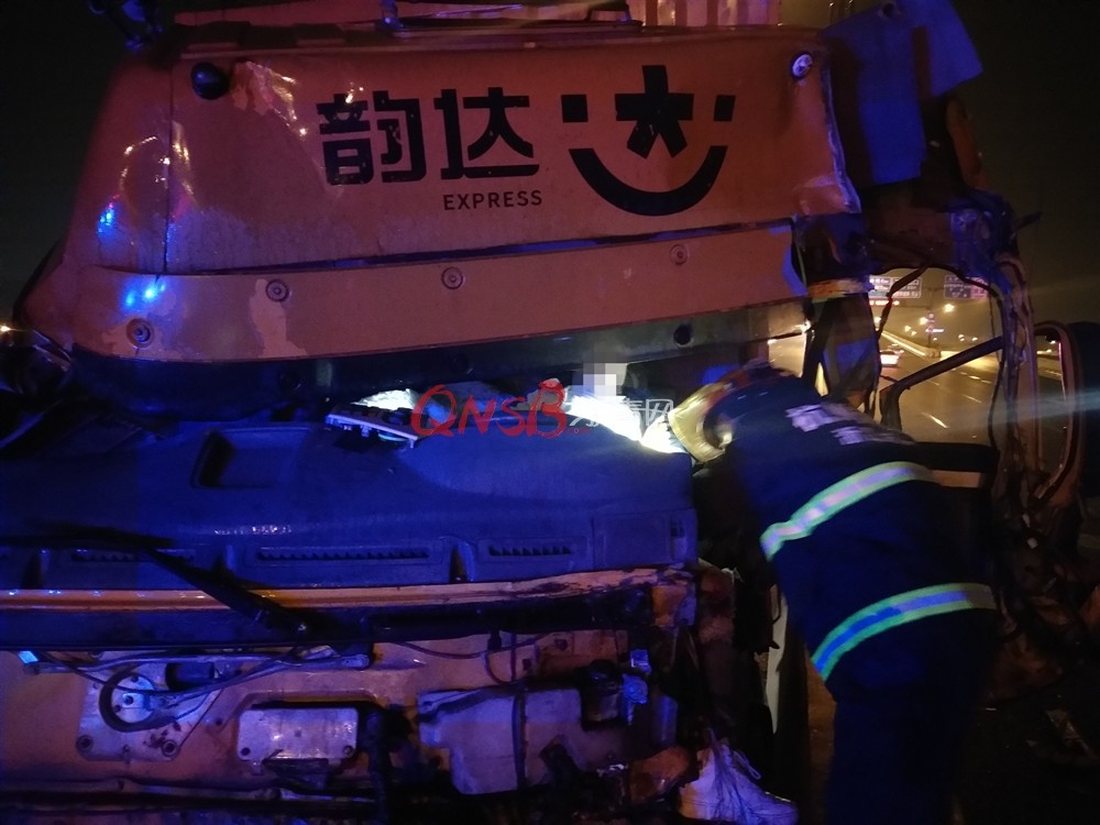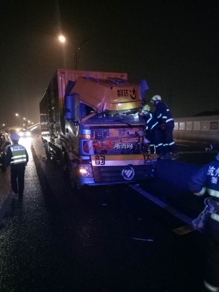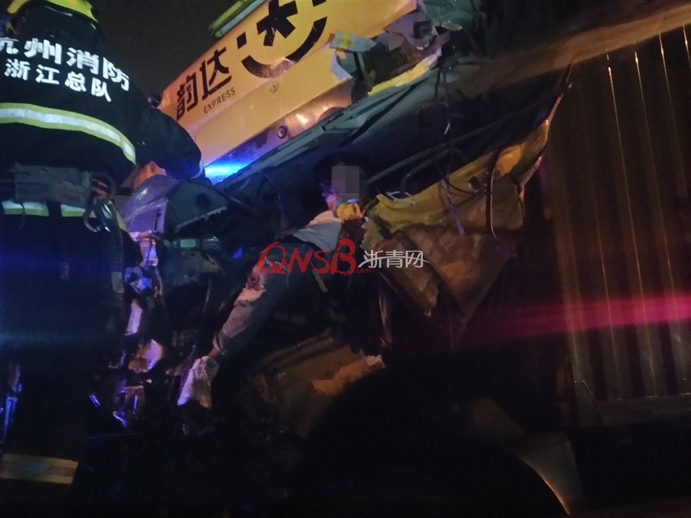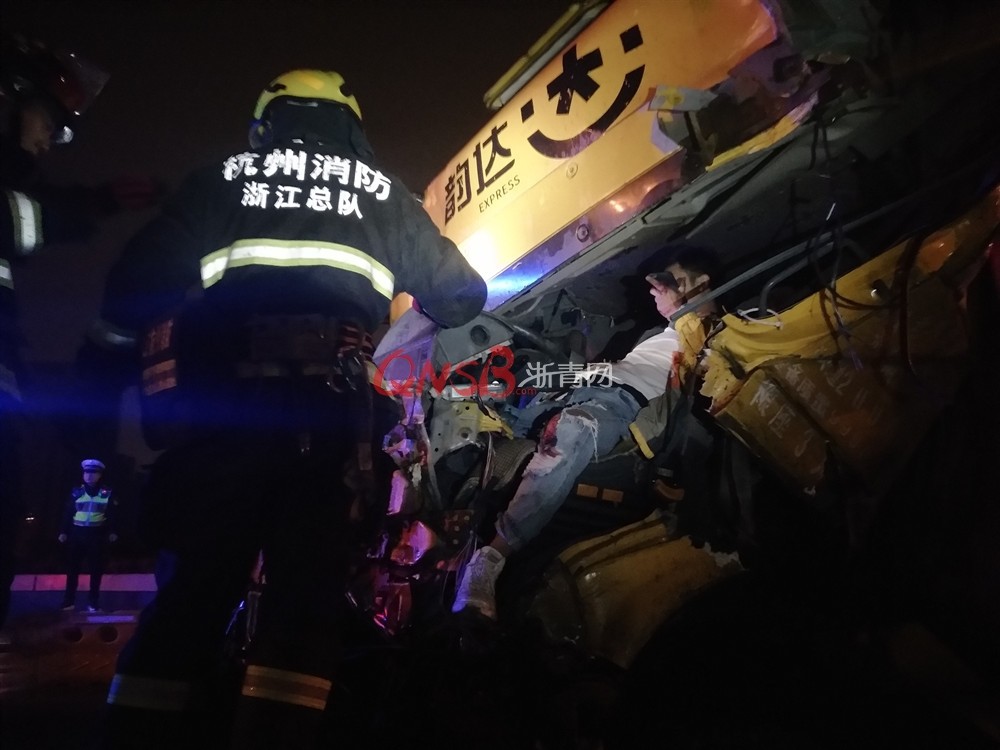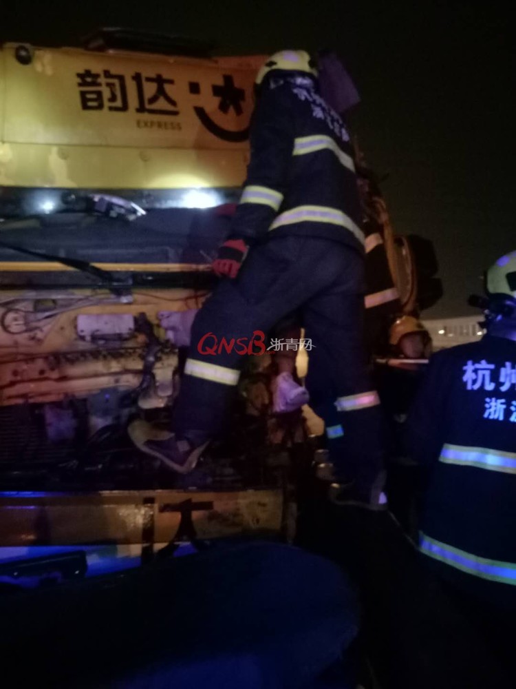 01时43分,九堡中队到达现场,立即对现场进行勘察,发现是一辆韵达快递货车撞到了中间隔离带,驾驶员卡在驾驶室内,无法动弹。指挥员立即下令展开救援。经过五分钟的救援,驾驶员成功被救出。01时51分现场处置完毕跟交警交接后中队返回。