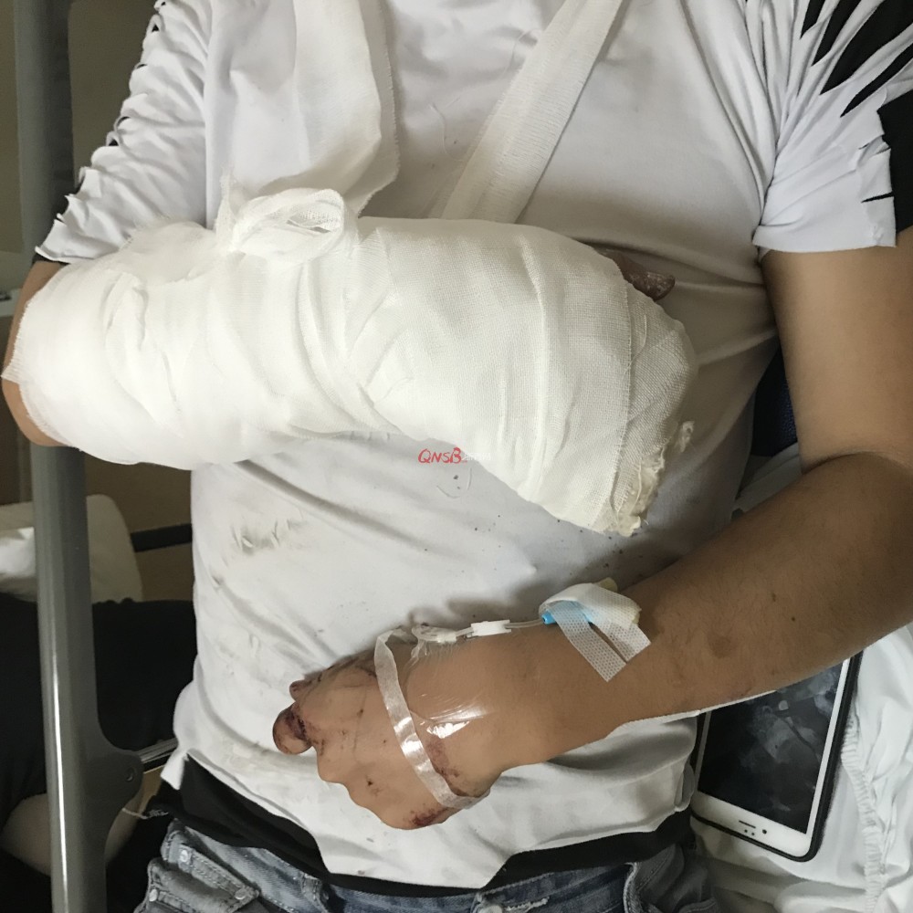 小孟躺在病床上挂吊瓶,左腿裤脚破了一个大口子,可以看见膝盖受伤处已经包扎处理过了。小孟的右手缠满绷带,左手布满了污渍和干涸的血迹。