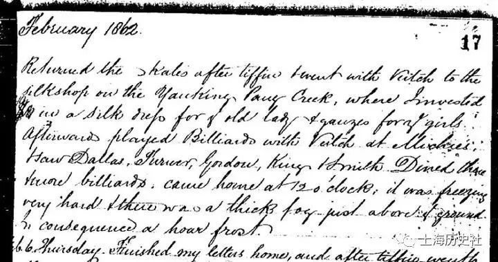 图7:1862年2月5日,萨道义在上海的一篇日记记录了他混迹英国商界的事情:“后来,我在米奇餐厅和维特恰特一起打台球并且认识了达拉斯、特纳、戈登、金以及史密斯。”(汉译文,资料来源:英国国家档案馆之萨道义爵士档案)。