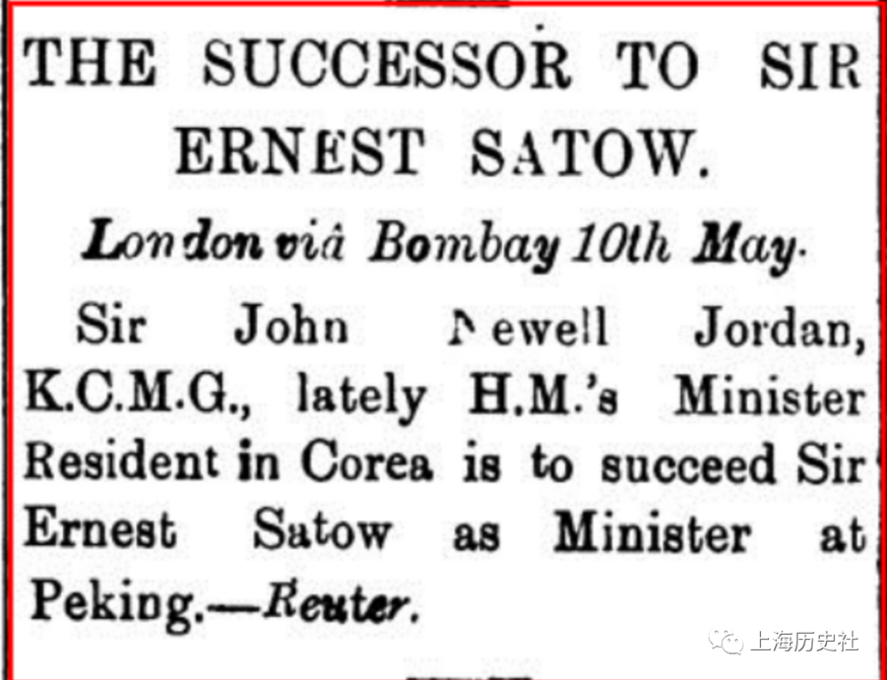 图13:上海英文日报《The North-China Daily News》(字林西報,1906年5月11日刊第7版)还刊登了英国驻大韩帝国公使朱迩典爵士(二等勋爵士)将接替卸任回国的萨道义爵士就任英国驻华公使的新闻《THE SUCCESSOR TO SIR ERNEST SATOW.》。