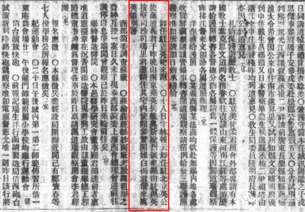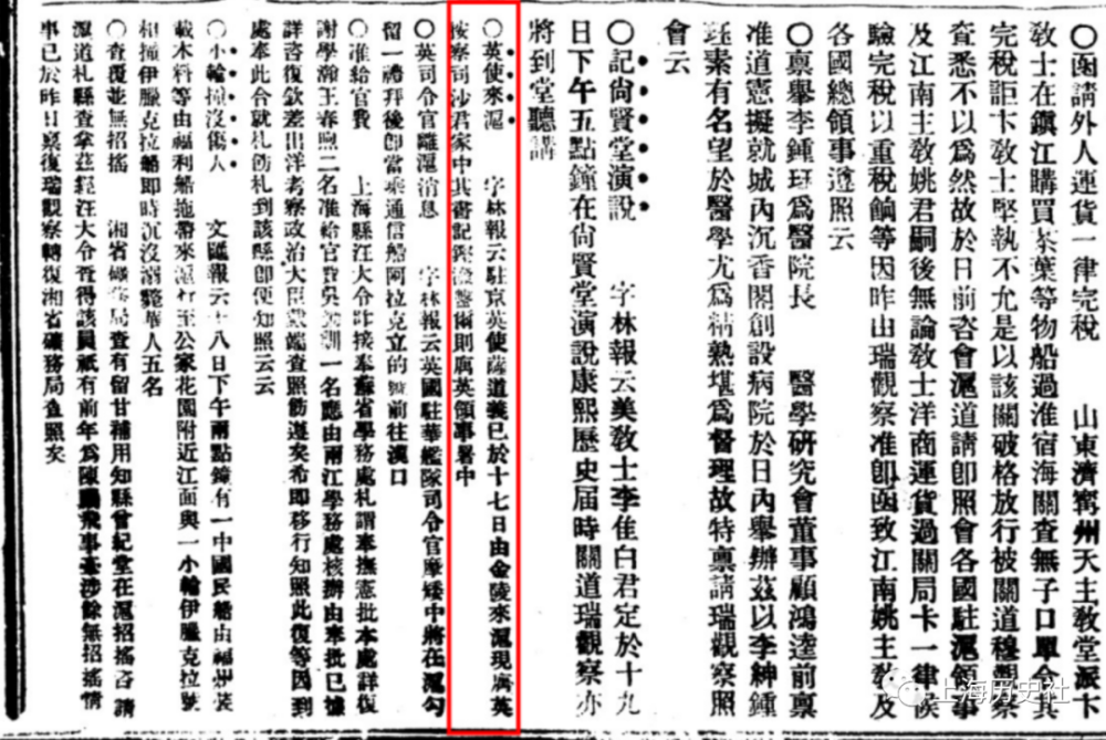 可见大英按察使苏墨立志爵士夫妇在公共租界西区斜桥弄设饯别宴款待即将离沪回国的萨道义爵士。而陪同英使来沪的公使馆秘书甘伯乐(三等勋爵士)则下榻在黄浦滩的大英总领事官邸。