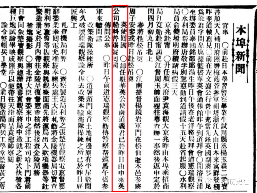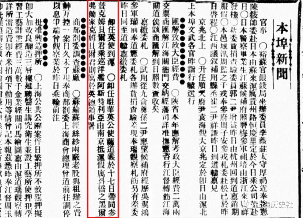 图15:上海华文日报《新聞報 THE SIN WAN PAO》(1906年5月12日刊第十七版本埠新闻):《卸任英使到滬》。