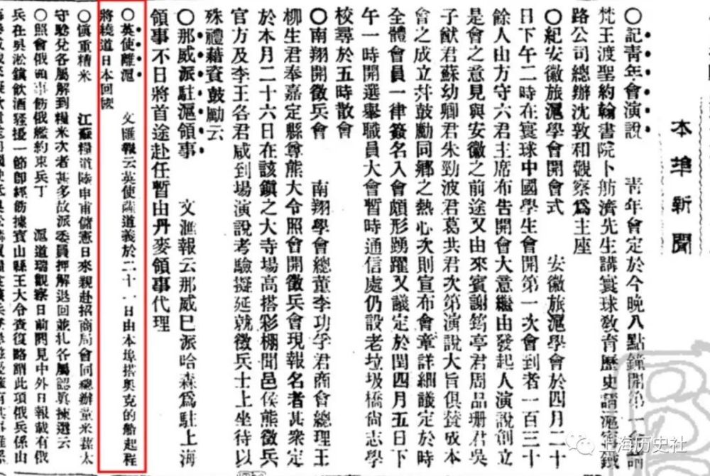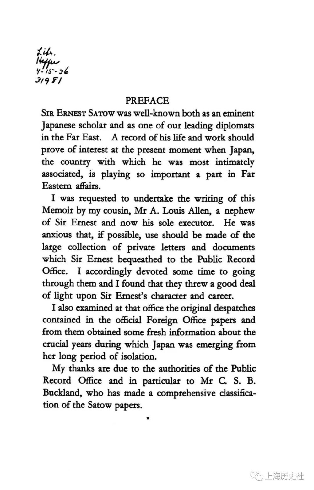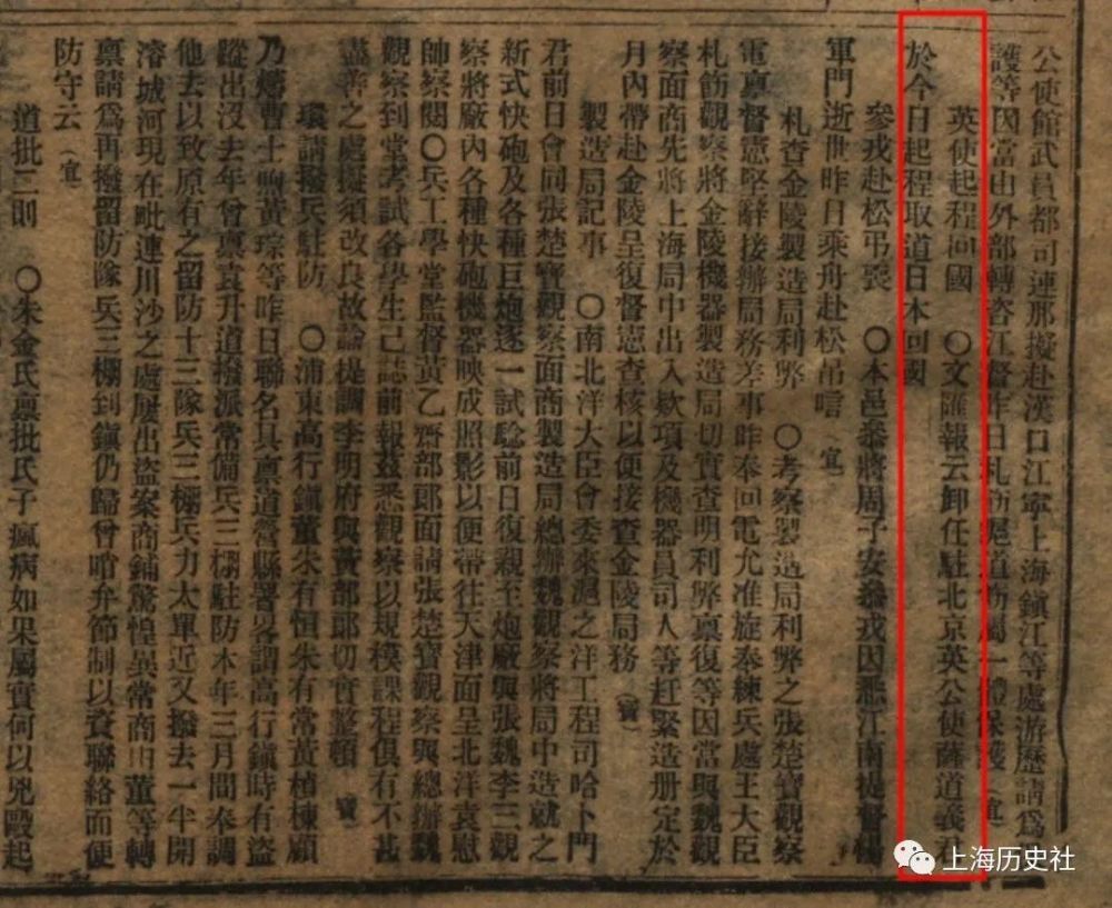 上海往往是是清末民国时期西方使节来华赴任的第一站,亦是他们卸任离华前的最后一站。1906年5月10日,卸任英国驻华公使萨道义爵士由宁抵沪,在沪稍作勾留并与沪上英国领事馆官员及旅沪英侨酬酢叙谈后于5月14日乘轮离华,此后亦再没回到上海和中国。他离开上海后并没有急于直接回国,而是先前往他外交事业的开端地和他夫人的故乡--日本。