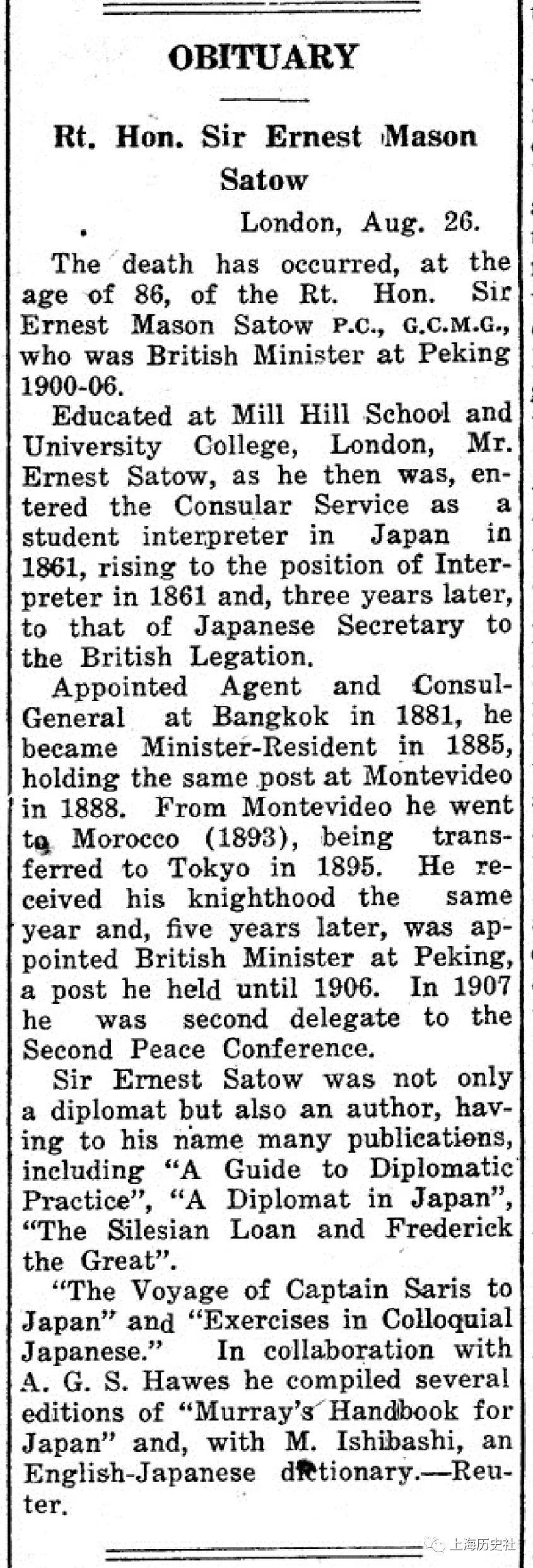 “London, August 26.--The death has occurred, at the age of 86, of the Rt. Hon. Sir Ernest Mason Satow, P.C., G.C.M.G., who was British Minister at Peking 1900-06...”。