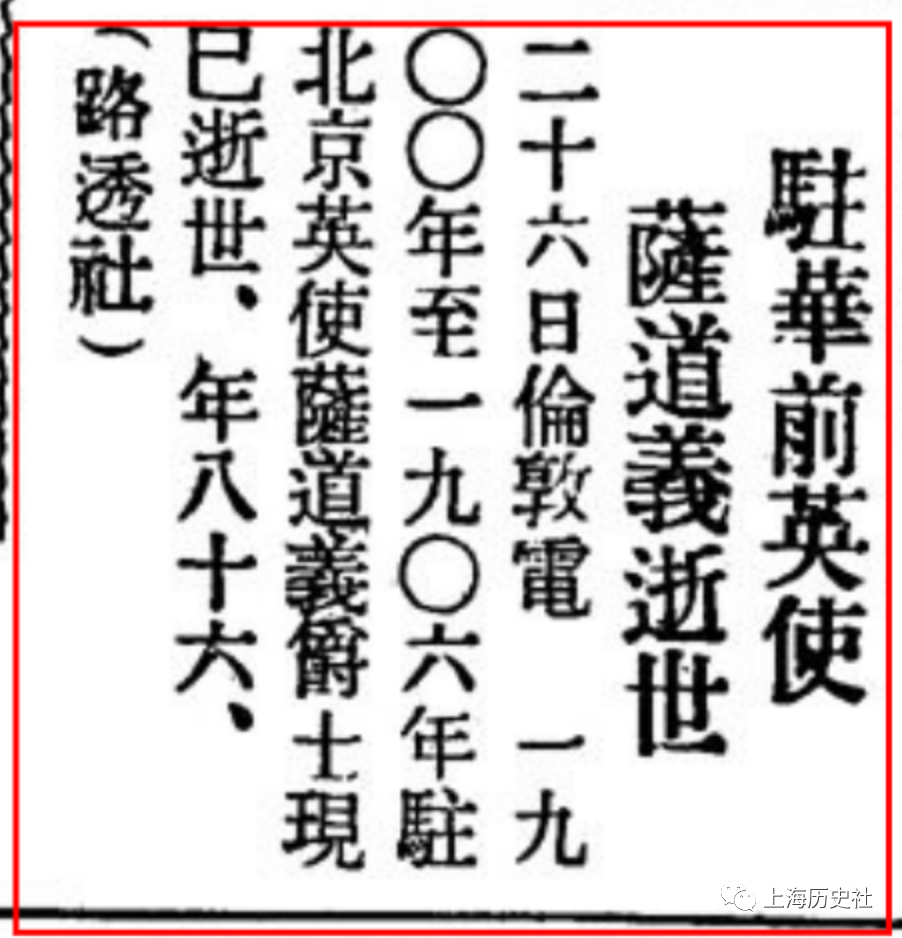 1929年8月28日,上海各大外文和华文日报皆刊登了前英国驻华公使萨道义爵士于8月26日在伦敦逝世的讣告。