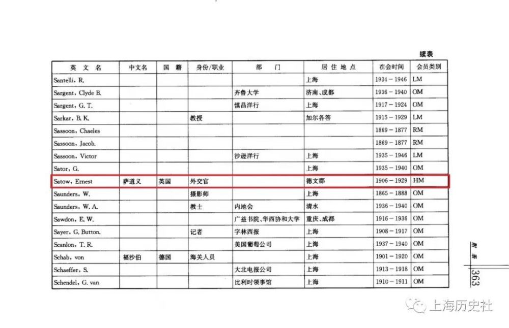图33:王毅著、2005年11月1日上海书店出版社出版的《皇家亚洲文会北中国支会研究》(第363页,续表)。画红框处可知萨道义爵士在退休离任英国驻华公使后的1906~1929年去世时为亚洲文会(中国分会)最高级别的名誉会员,常住英国德文郡。