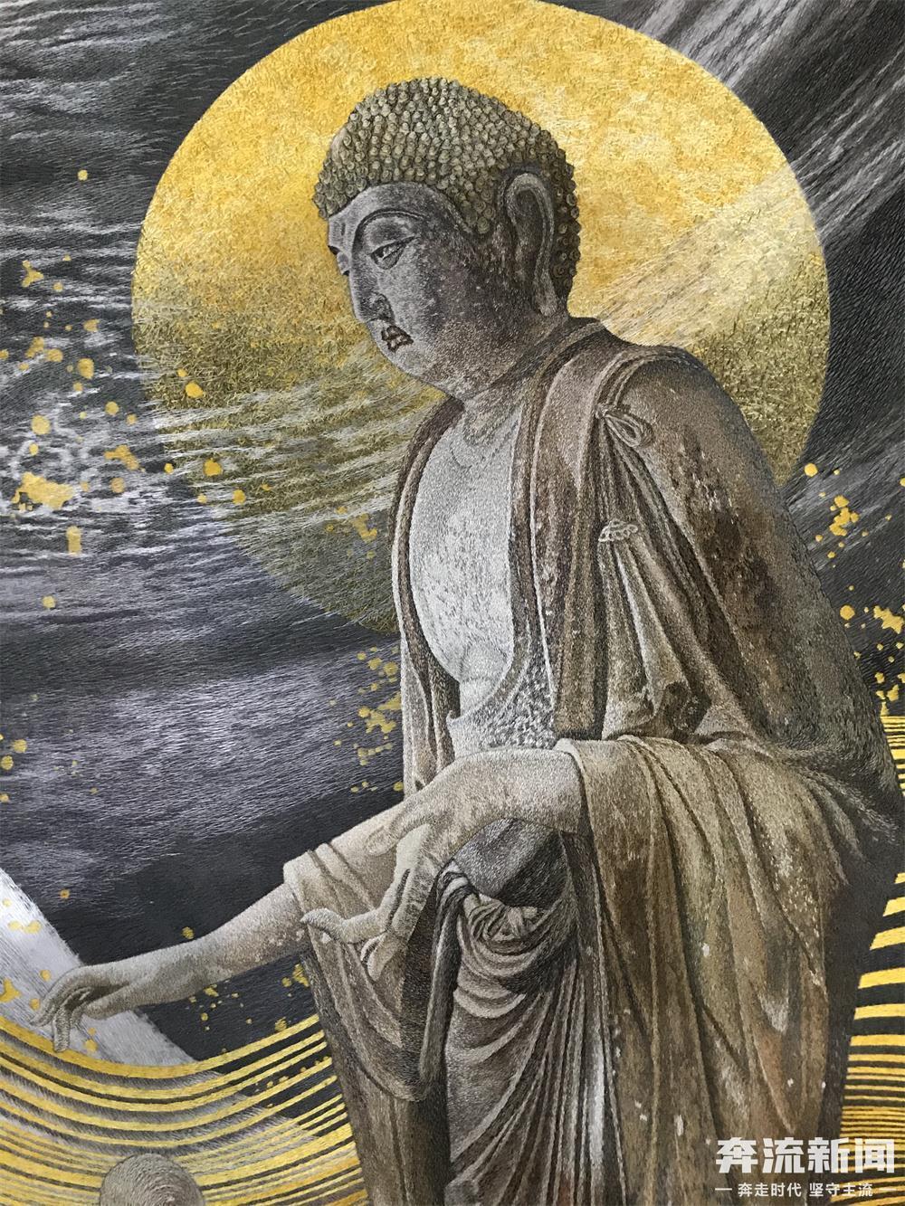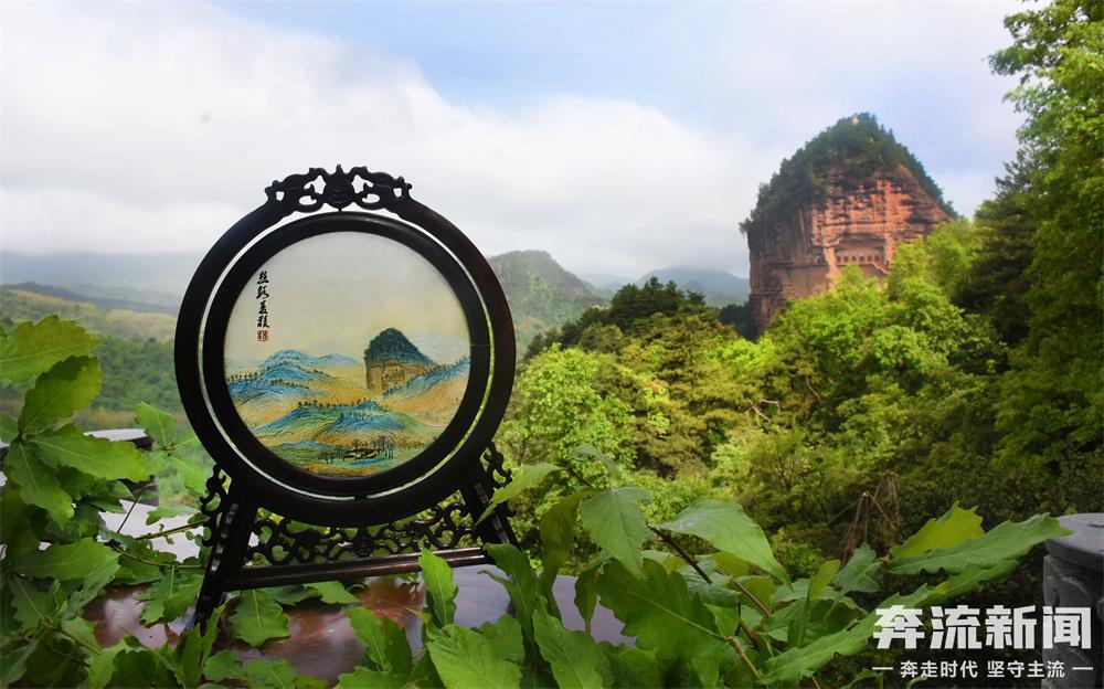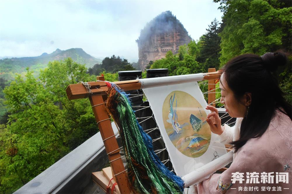 为了文创产品的研发,曹苑春曾多次去麦积山洞窟观摩、研究,写生,面对窟内用之不竭的文化源泉,她的创作灵感也是一触即发,触类旁通。她想到了中国水墨画的神韵,于是融入光影明暗空间感应用和绘画原理,转换针法,绣制出比较能表达石窟内涵和历经岁月侵蚀后的沧桑痕迹,其刺绣作品最终得到了广泛认可和肯定。