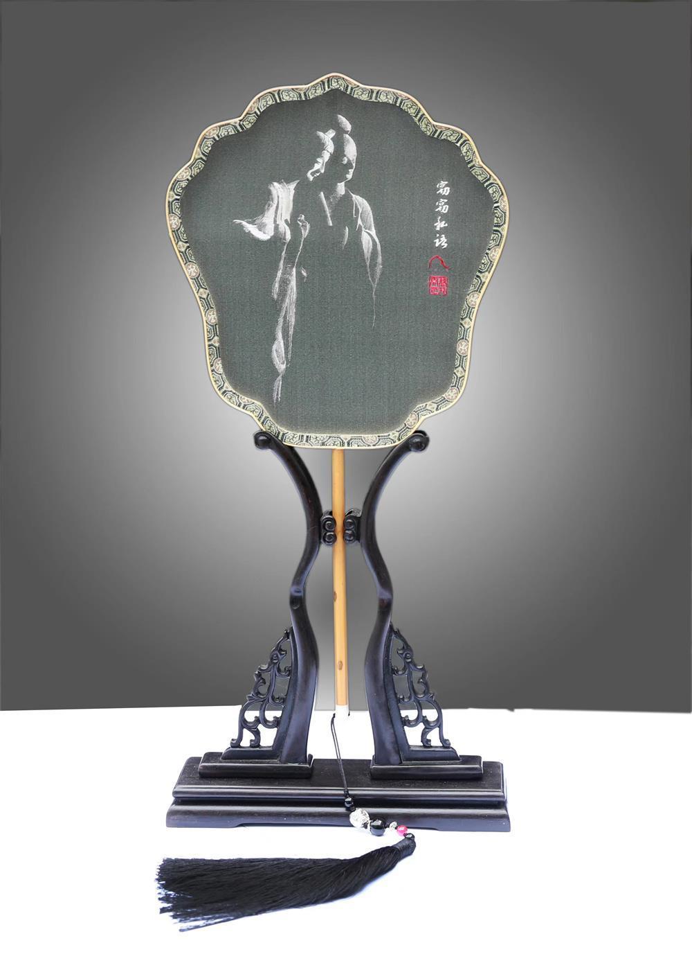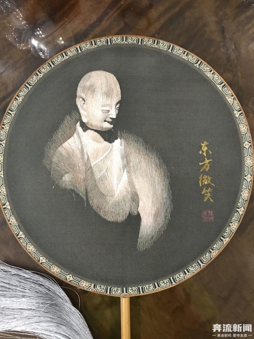 博古架上,扇面《东方微笑》《窃窃私语》,以及摆件《麦积秋色》《麦积烟雨》《佛背光》等均取材于麦积山石窟,当小沙弥千年不变穿越时空的迷人微笑与传承千年的丝织刺绣一经碰撞,作品呈现、流露出的韵味,除了作品本身之美外,更多地还有千年历史在一方丝绣小天地间的沉淀。