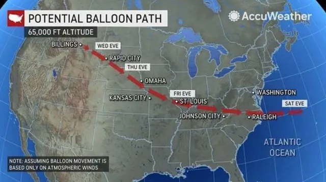 这几天,一只失控的“流浪气球”,从中国西部地区飘啊飘,从北太平洋飞越阿留申群岛,穿过加拿大领空以后进入美国蒙大拿州,向东南方向的堪萨斯州和密苏里州飘去。