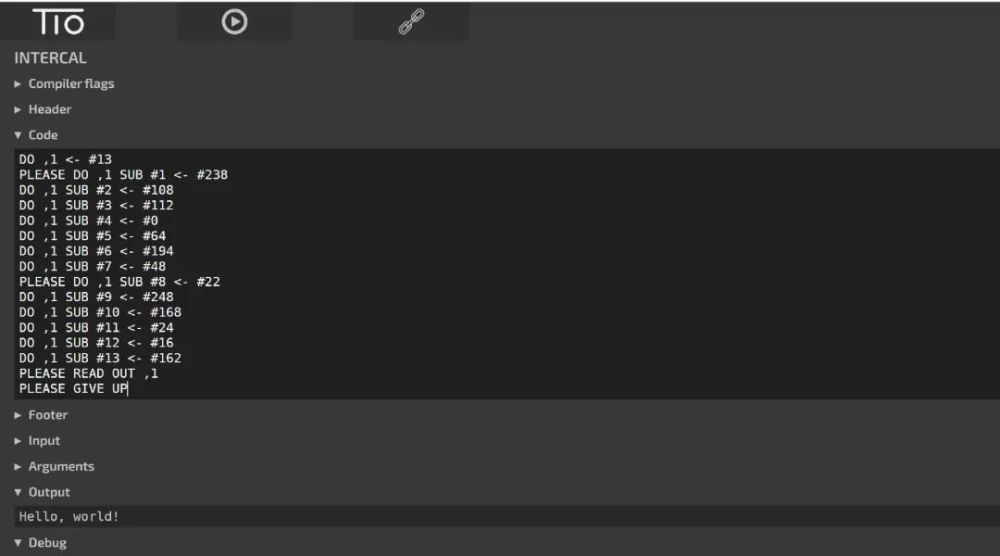 下面是 INTERCAL 中打印“ Hello,World! ”的代码片段。