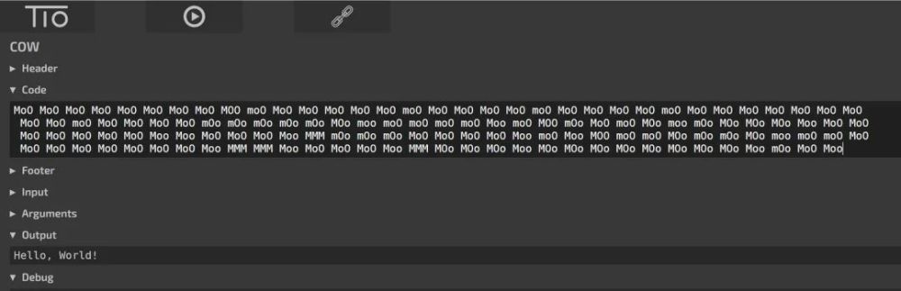 Cow在难度水平上与 Brainfuck 相似,与 Brainfuck 相比,它又多了4条命令,也就是说,整个语言中有12条命令。