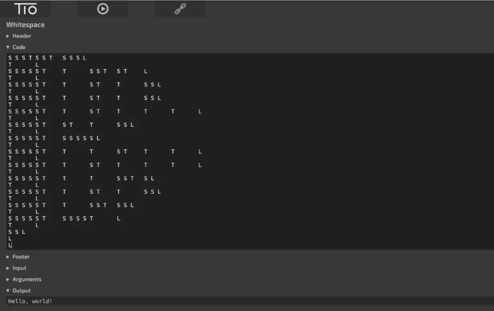 下面是用空格打印“ Hello World! ”的代码片段。在下面的代码中,每个空格、制表符或换行符前面分别加上注释“ s”、“ t”或“ l”。