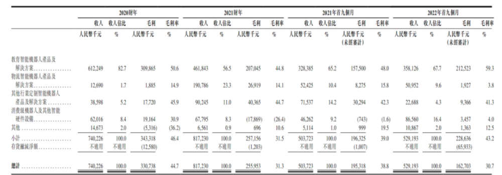 招股书显示,2020年优必选智能教育机器人产品以及解决方案收入为6.1亿,2021年则下降到了4.6亿。2021年1-9月,该业务收入3.28亿,2022年同期收入3.58亿。