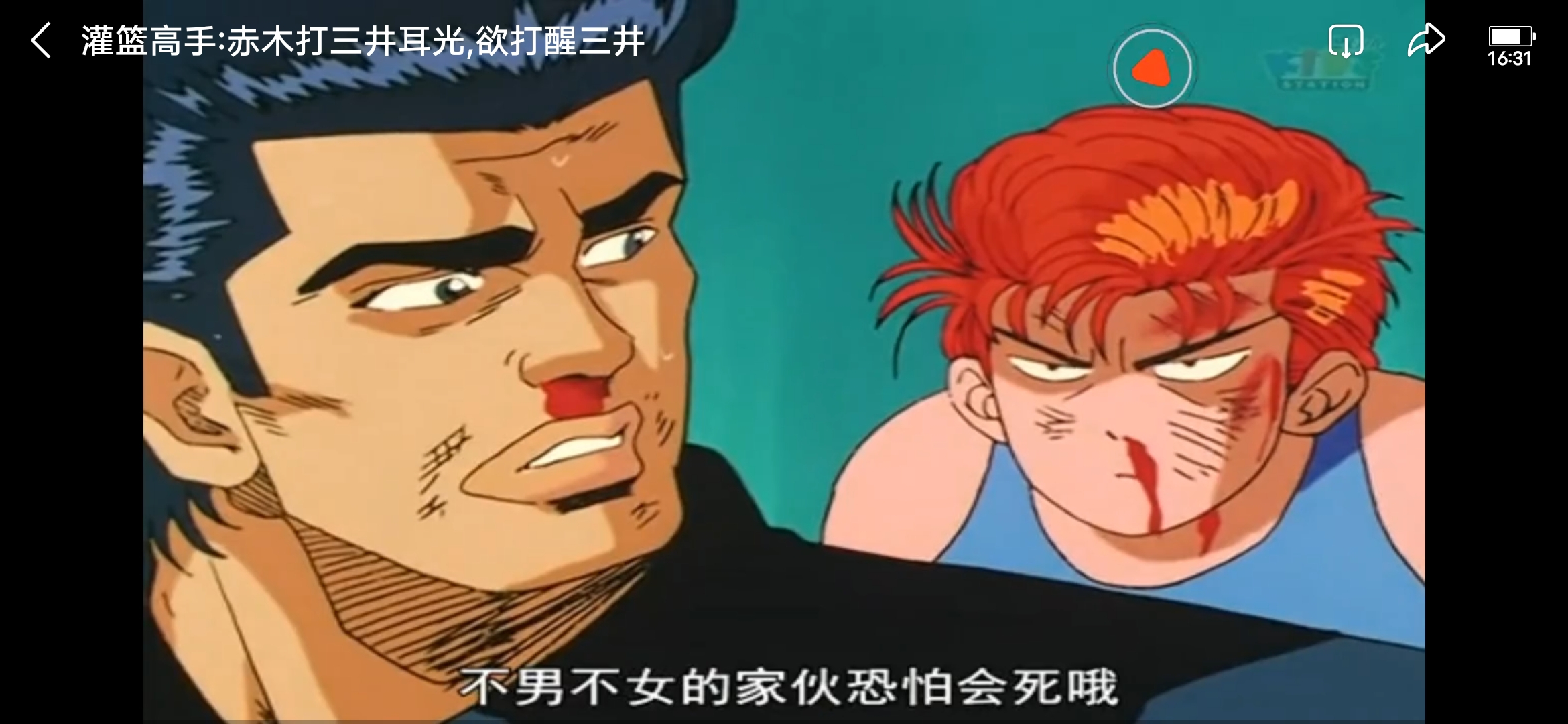 樱木:喂!他已经被洋平揍得很惨了,如果再被大猩猩揍的话…那个不男不女的恐怕会死掉!