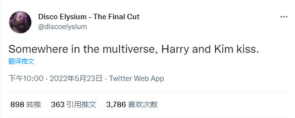 5月23日晚,《极乐迪斯科:最终剪辑版》官方推特发文称:在多元宇宙的某处,哈里和金接吻了。