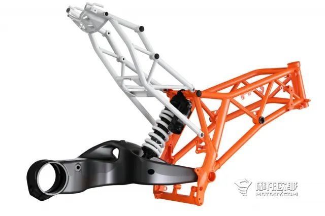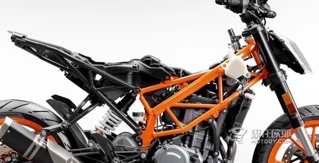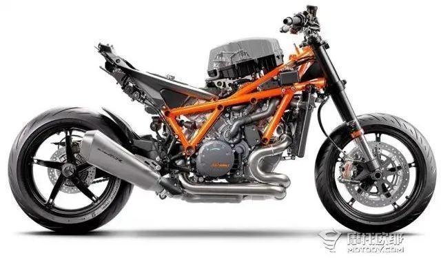 另一种结构是发动机在车架中受力,并且与车架共同构成受力结构,比如KTM790DUKE,以及最新一代的1290 DUKE,这种车架在各方面的性能也很好,只是在发生事故时,发动机受损的概率也会增大。