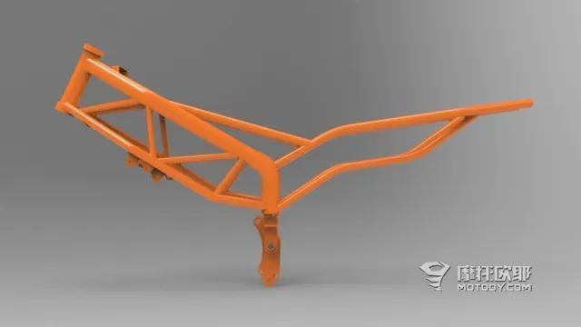 透过图我们可以看到,车架的侧面也很饱满。我们最常见的钢管编织车架可以分成两种,一种是发动机受力,但不作为主要受力部件的,比如KTM 390 DUKE,可以看到他的车架是由多根钢管焊接而成,结构中充斥着三角形,同时发动机也被吊挂在车架下方。这种结构的优势在于在维持轻量化的同时,还能保证车架各方面的刚性,综合性能没有什么短板,而且在发生事故后的修复成本较低,至少有可能修复。