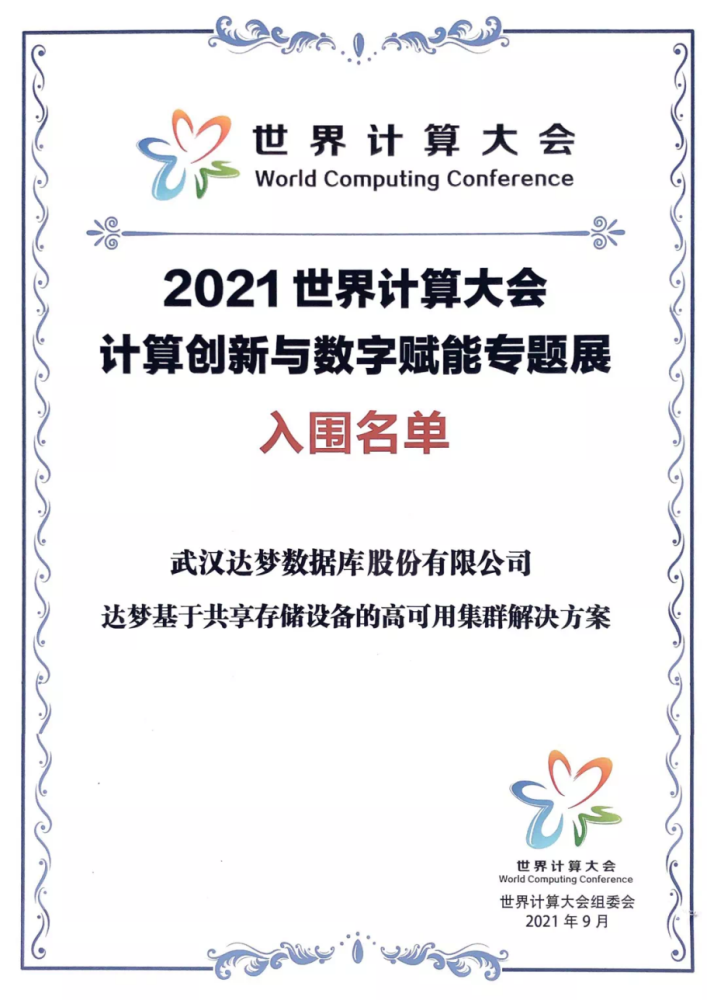 经过实践演化出的达梦数据共享集群(DMDSC)正符合国家信息安全需求,是“国产化替代”阶段性成果。2021年9月在成都进行的2021世界计算大会,达梦数据共享集群入围创新成果展示。