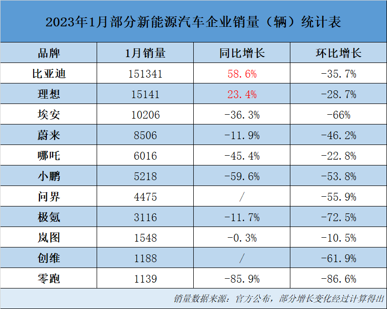 根据各品牌最新公布的数据,1月份新势力品牌表现疲软。即便在1月市场观望气氛浓厚、普遍环比下跌的背景下,不少新势力品牌的跌幅也超出了人们的预期:蔚来跌46%,小鹏跌54%,问界56%,零跑的跌幅更接近87%——这可是去年新势力品牌的月度“销冠”。