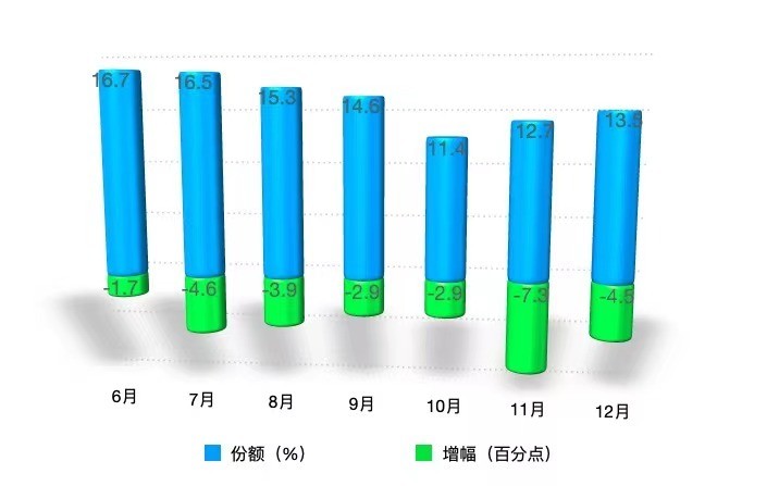 此消彼长,新势力回撤的同时,是“传统品牌”不断在拿回失去的市场:比亚迪带动下,传统自主品牌的份额在去年12月达到了70.6%,较一年前增加了11.4个点;甚至屡屡被吐槽的合资品牌新能源汽车都拿到了6.5%的份额,同比微增。