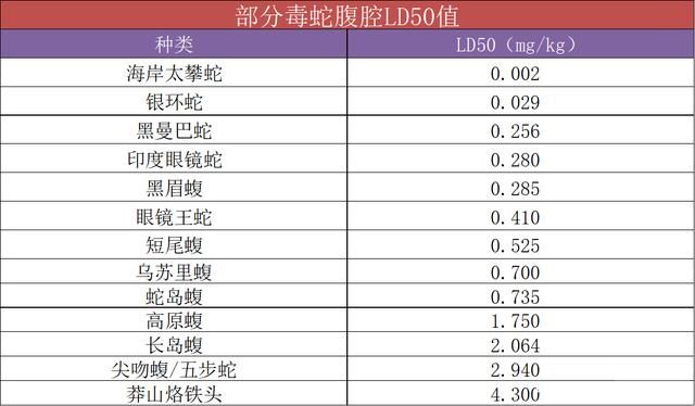 LD50值是毒蛇毒性评定标准,即能杀死一半实验动物的剂量,实验方式有静脉注射、腹腔注射和肌肉注射以及皮下注射等几种,LD50的值越小,表示毒性越强。