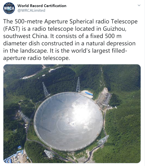 据世界纪录认证机构(WRCA)官方全球数据库显示,500米口径球面射电望远镜(英语:Five-hundred-meter Aperture Spherical radio Telescope,简称FAST)是中国科学院国家天文台的一座射电望远镜,焦比达0.467,被誉为“中国天眼”。FAST位于贵州省平塘县克度镇大窝凼洼地,利用喀斯特洼地的地势而建。其主体工程于2011年开工,2016年落成。FAST是目前世界上最大的单一口径、填充口径(即全口径均有反射面的)射电望远镜。