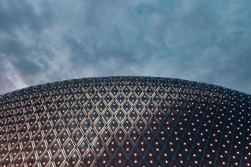 新展馆被半透明的媒体立面所覆盖,该立面由iart与建筑师合作开发。它共有10000块菱形有机光伏板和30000颗嵌入式LED,LED不仅向外发光,而且还向下方金属外壳的方向发光——使它们的光通过半透明的太阳能模块反射和闪烁。