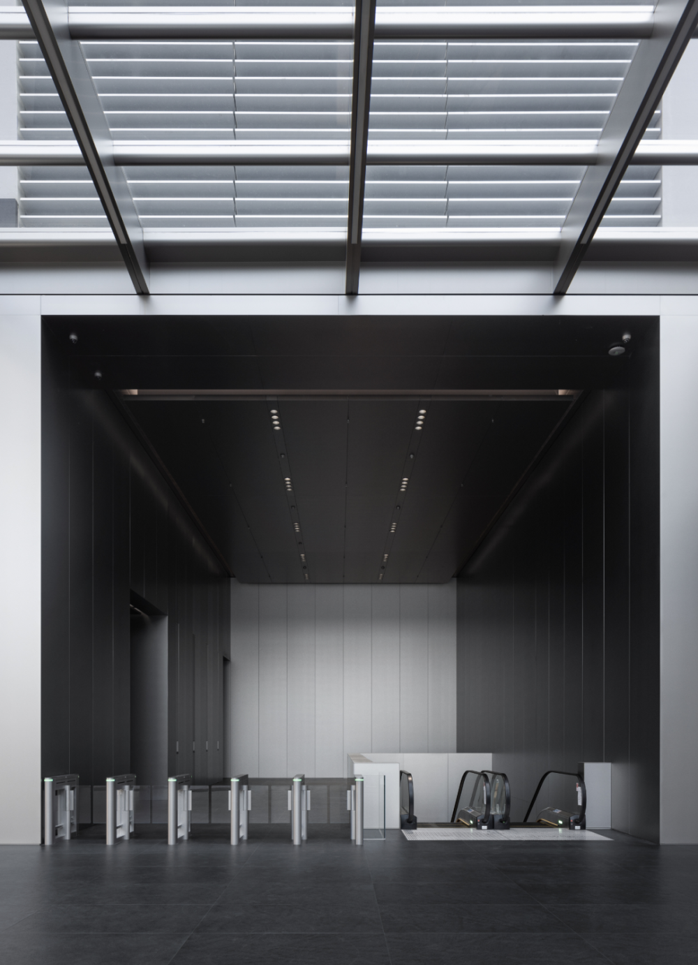 从裙楼底部走进半开放的「庭院空间」,这里成为城市与办公大楼的空间过渡。