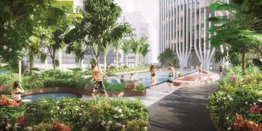 每日,来访者在如雨林般的底层花园广场中穿梭和会面。曲折婉转的花园小径将人缓缓引入大厦旁边一座19米高的绿荫环境。