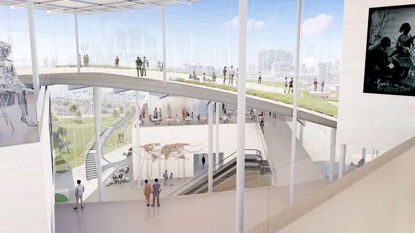 音乐博物馆的顶部将是一个白色的屋顶,屋顶上点缀着近100个树木生长的洞,并用玻璃板制成的墙包裹起来。