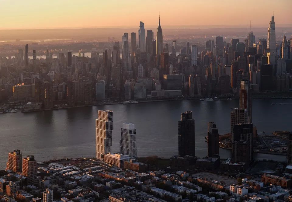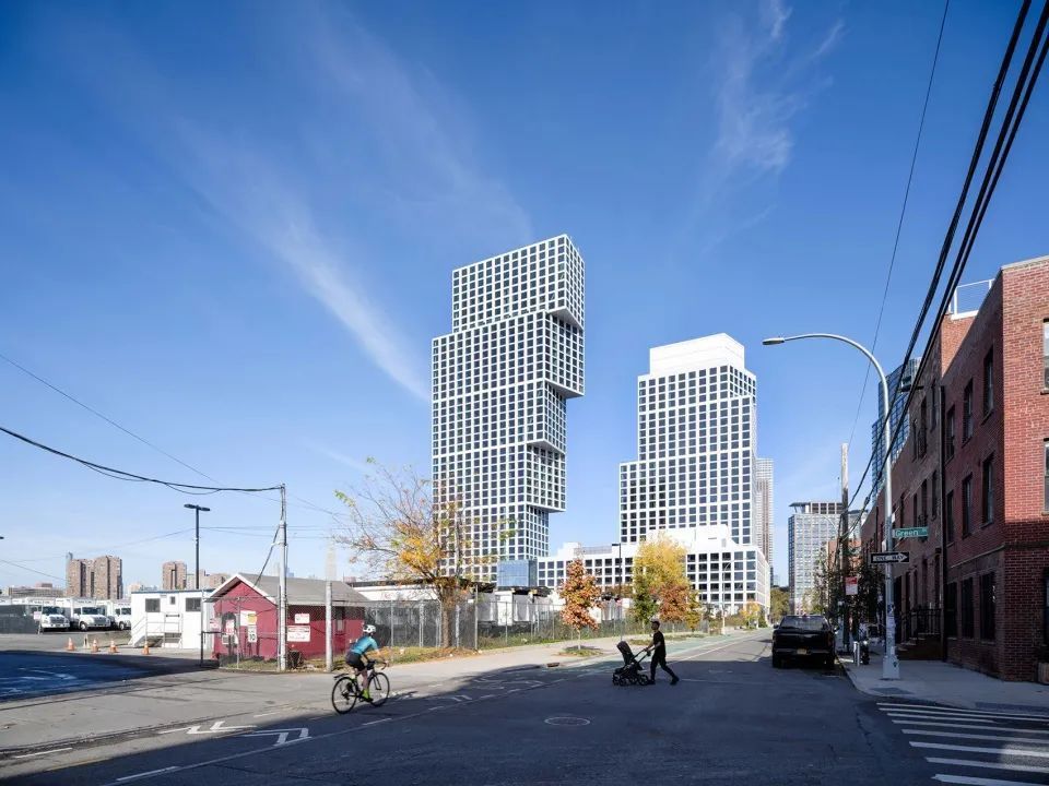 两座塔楼相互倾斜和远离。较高的塔楼在上升时向东变宽,最大限度地扩大了视野,并为社区创造了一个引人注目的立面。较矮的塔楼如同较高塔楼的异卵双胞胎,向地面加宽,向北面的新海滨公园拓展。两座塔楼的形状构成了梯田和悬挑一般的结构,设计强调将它们连接在一起,好像它们是从一个街区分开的一般。如同一个金字塔及其倒置模型,这对建筑截然不同,但又由于它们之间的空隙而紧密相连。塔楼的阶梯形式和立面的清晰度调节了两座塔楼与现有社区之间不可避免的尺度对比。台阶将塔楼分成七到八层高的街区,与邻近建筑物的规模相呼应。