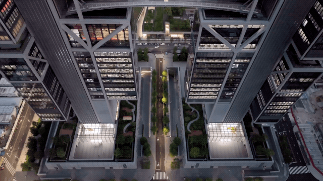 整个项目由东、西两栋超高层塔楼组成,每栋塔楼各有六个巨大的“玻璃体块”,依托核心筒,错落有致地悬挂在延伸出来钢结构上。