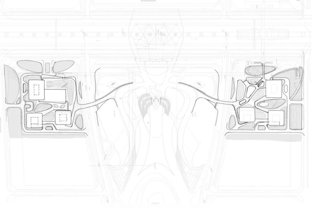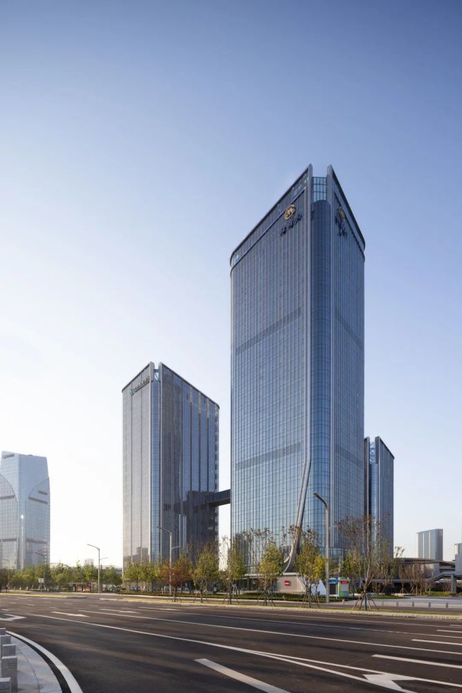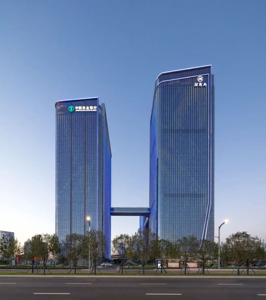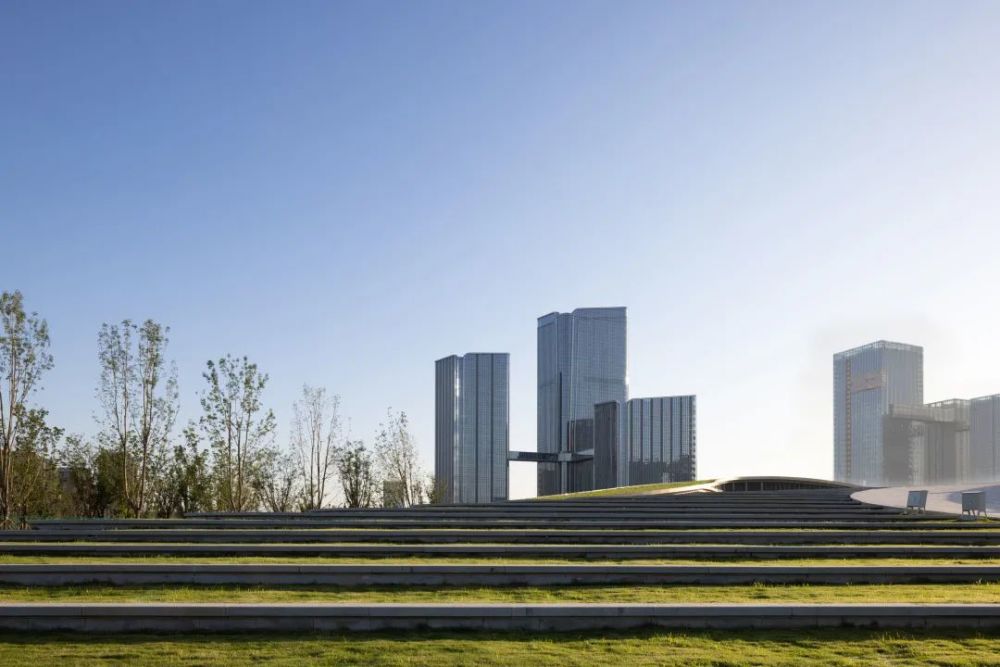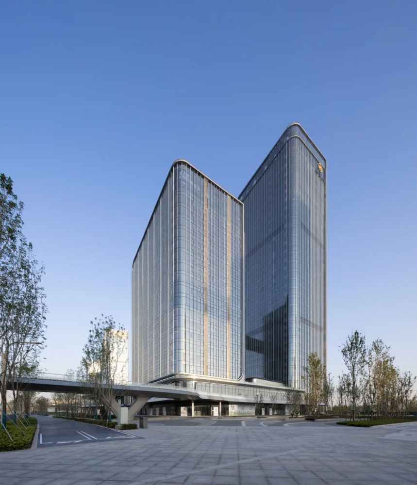 由三益主持设计的招商蛇口西安丝路中心项目,是本次第十四届全运会重点配套项目之一。项目由南北两个地块组成,分别位于奥体中轴公园“长安谷”主轴的南北两翼,建筑沿中轴对称布局,作为“奥体之翼、中轴之门”,与奥体中轴生态公园相辅相成,隔景观带对称分布的两座三体式建筑群落形成环抱奥体的空间形态,既体现了开门迎客的寓意,又塑造了西安城市门户形象的效果。