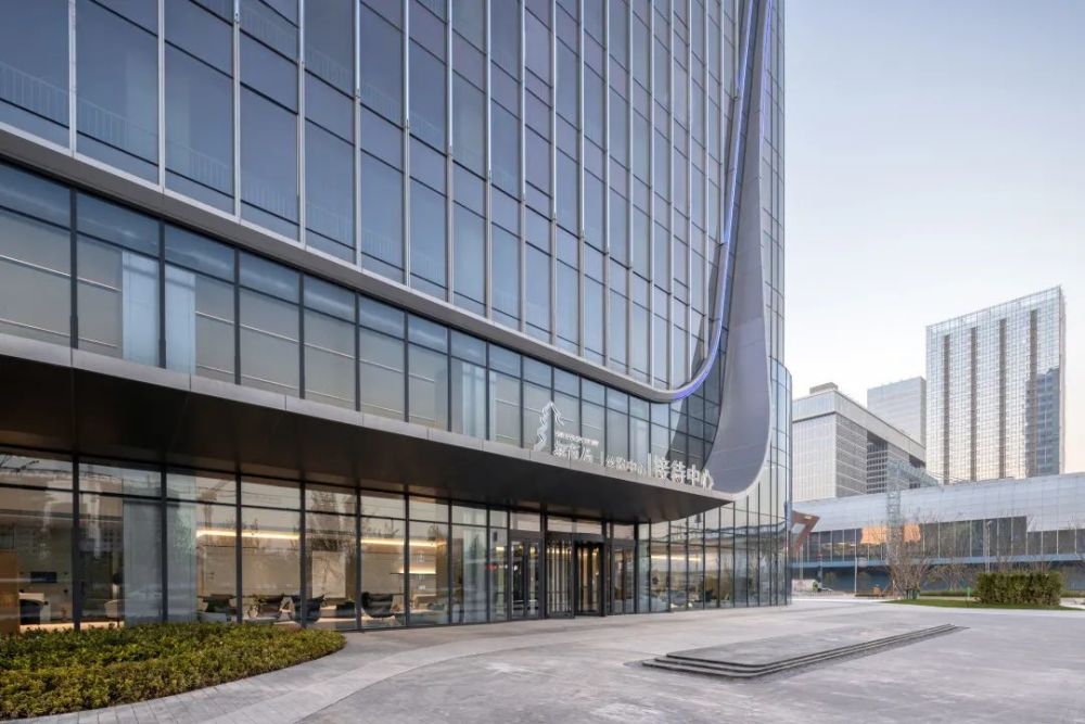 项目设计整体采用了现代简约的风格,立面简洁大气,从西安代表性历史文化中汲取灵感——城、门、水结合成数栋玻璃立方体,以现代感元素勾勒出具有时代气息的建筑。