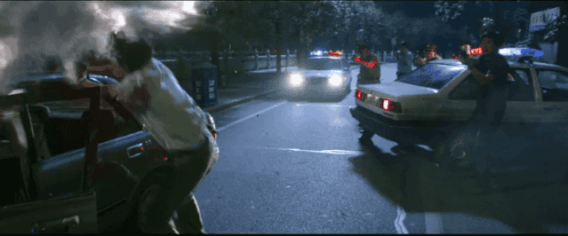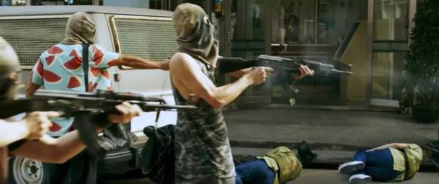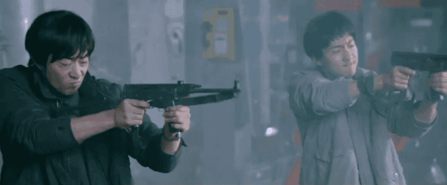 商业警匪片就是这样啊,《英雄本色》《喋血双雄》扯不扯?夸不夸张?打起来照样是光环刺眼嘛,我觉得《除暴》相比之下算写实了。(片中还真出现了喋血双雄)