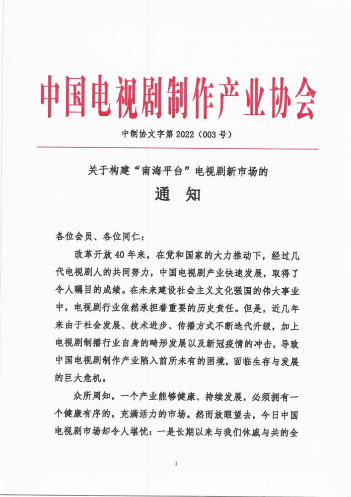 1、中国电视剧制作产业协会发布《关于构建“南海平台”电视剧新市场的通知》
