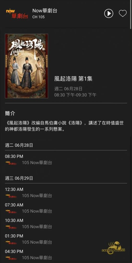 6月24日,由爱奇艺、留白影视、洛阳文保集团联合出品,谢泽执导,黄轩、王一博、宋茜领衔主演,宋轶特别主演,咏梅特邀主演,刘端端特邀出演,张铎、张俪、张晞临、高曙光、施羽、宁文彤、冯晖、韩帅特别出演的古装悬疑剧《风起洛阳》宣布于6月28日晚8:30起在香港NOWTV电视台—NOW华剧频道(CH105)播出。该剧改编自马伯庸所著的小说《洛阳》,讲述了在时值盛世的神都洛阳,出身不同阶层的高秉烛、百里弘毅、武思月因为共同的目标而结盟,调查洛阳各种悬案,最终粉碎春秋道的阴谋,守护神都太平的故事。