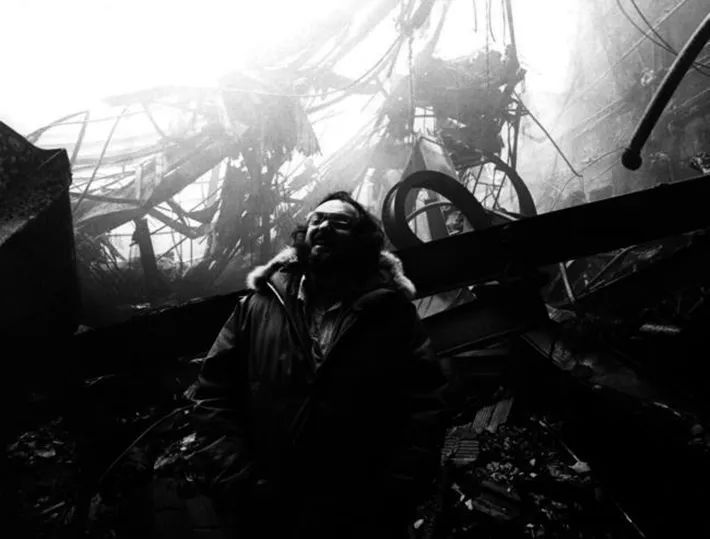 9. 斯坦利·库布里克在埃尔斯特里工作室的废墟中大笑,这里是《闪灵》的片场,在一场大火中被毁。