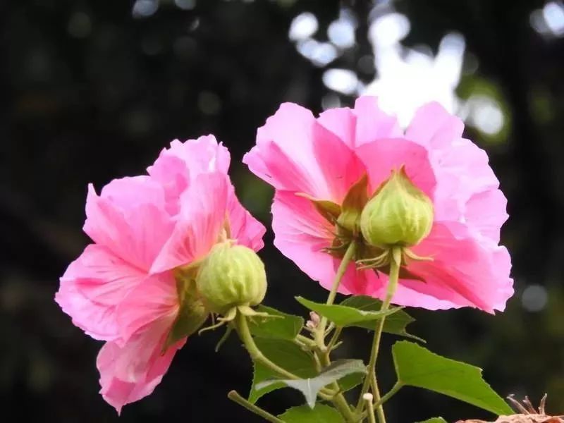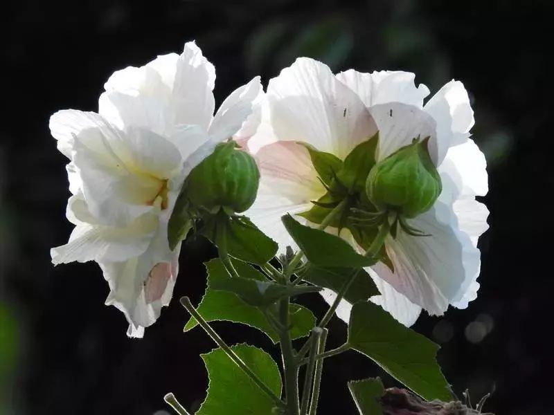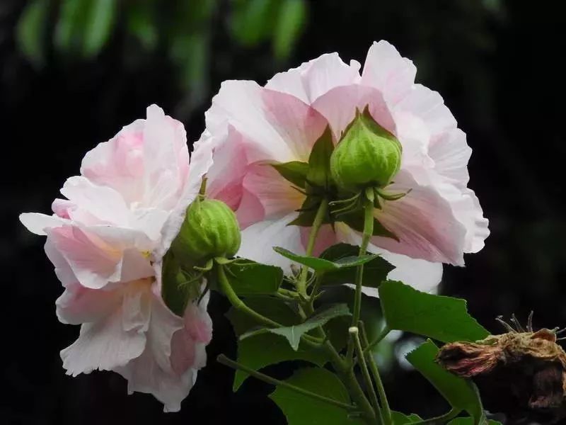 木芙蓉在早上是纯白色的,到了中午,就渐渐变成了淡粉色。