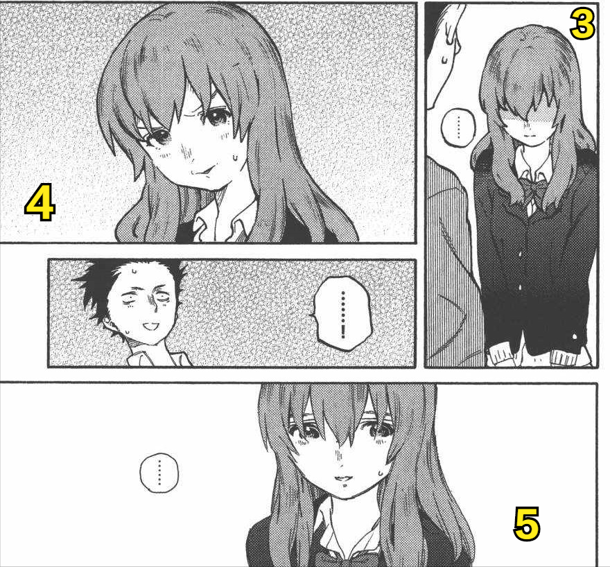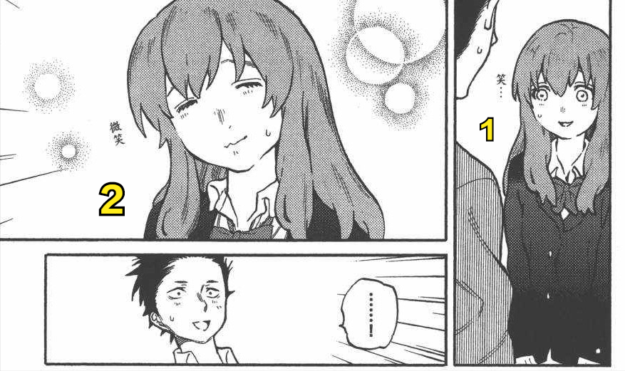 随后右一的茫然愣住的表情可能是拼命地回忆,确认眼前石田将也的身份。而右二则可能时已经大致能联想到将也的身份,回忆起这位小学同学,然后习惯性地露出“西宫式”招牌讨好笑容。