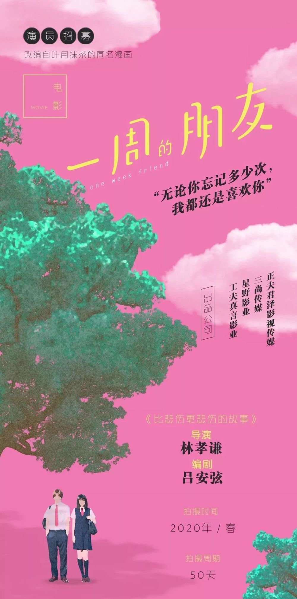 工夫真言影业电影项目《一周的朋友》演员招募于2019年11月底正式启动,将于2020年春拍摄。“无论你忘记多少次,我都还是喜欢你”,这部催泪治愈的青春童话,将由导演林孝谦和编剧吕安弦亲自操刀。片中的“金鱼系女主”、“忠犬系男主”,这样的人设本就很讨当下年轻人的喜欢,而新颖的情节设定也会令人耳目一新。这是工夫真言成立三年来的第一部电影项目,标志着工夫真言在剧集领域之外,将首次进军电影领域。