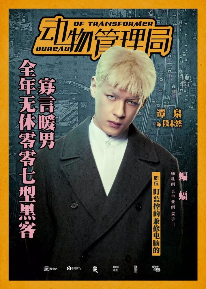 在工夫真言影业出品的都市寓言故事《动物管理局》中,谭泉饰演高冷帅气的蝙蝠探员段未然。这位名副其实的程序蝠是动物管理局的信息处主任,银发浅眸颜值在线,嗓音颇具磁性,高冷帅气却又暖男感十足。谭泉在剧中的出彩表现受到观众的一致认可,他也凭借着这个角色俘获一众少女心,圈粉无数。